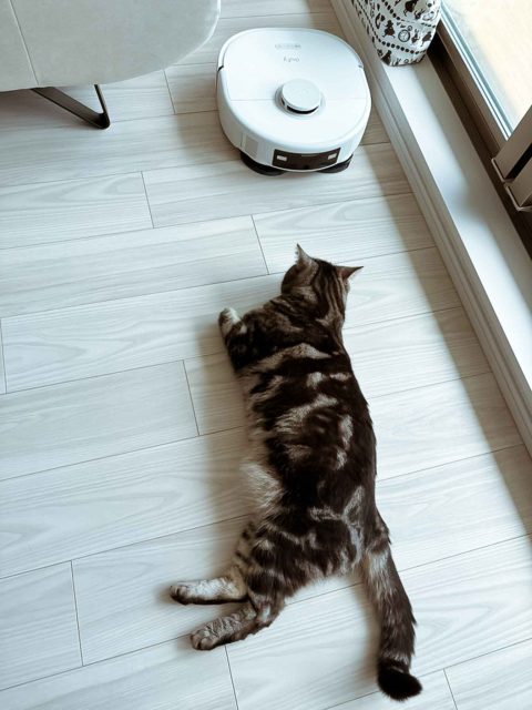 お世話中にお掃除ロボットが稼働し始めましたが、こはく君に近づいて来ても全く動じません(笑)