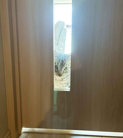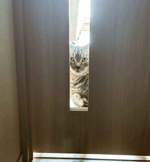 そ〜っと玄関を入ると、奥のリビングのドアからこちらを見ているこはく君の姿が‼️