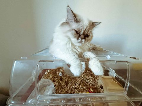 ハムちゃんにとって天敵のはずの猫ちゃんとの同居生活を送っていますが全然へっちゃらです✨