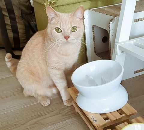 まめくんが「ごはん早くちょうだい」とお皿の前で待機して
