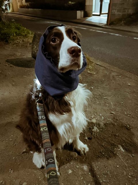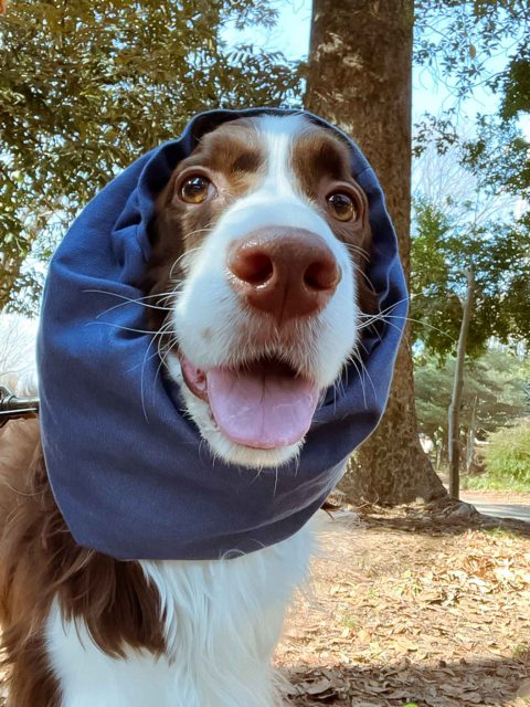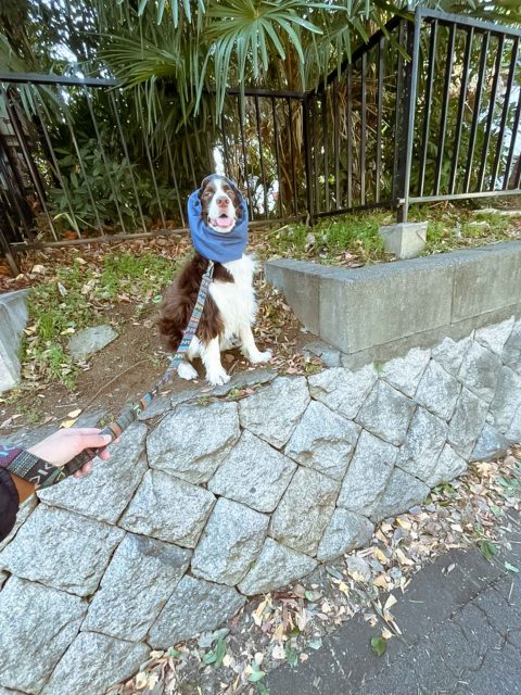 打ち合わせ通りに、お座りして、首輪や、お耳のカバー装着して元気いっぱいお散歩へ♡