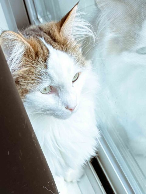 窓辺に座り、外の景色をじっと見つめるバジルくん。