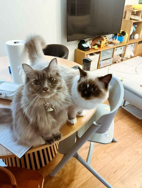 チュールを用意してると2人は仲良くテーブルの上でスタンバイ😊