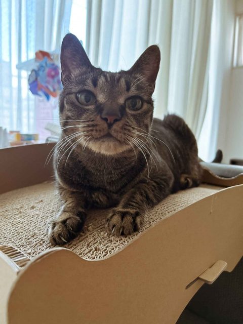 怖がりさんで隠れた時は「にゃお〜んうぉ〜ん💢」と不機嫌なお声。