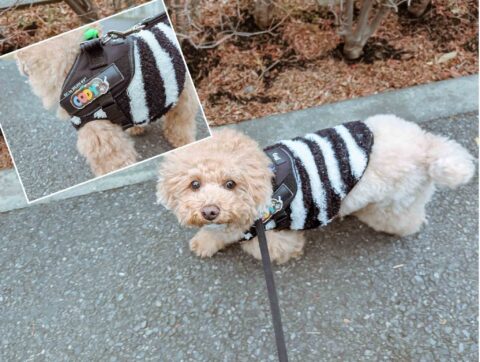 最近のマイブームはお散歩から帰って。置いてあるシッターさんのマフラーを取って逃げること(^^)ボクが逃げて、シッターさんが追いかけるー全然捕まらない。なにしろボクは足が速いからね