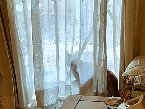 もっとこわがりさんの らんちゃんはカーテンの向こうから警戒心max!
