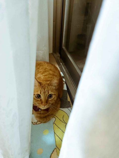 らんちゃんはやっぱりカーテンの後ろが落ち着くのね😸