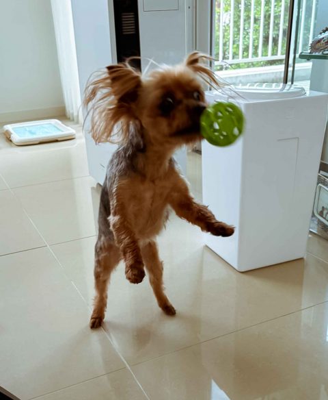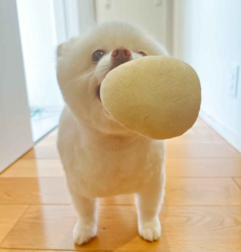 大きなアンパンマンのぬいぐるみを、くわえて来て見せてくれるプリンちゃん😆