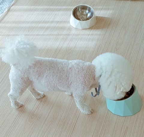 白い器は既にプリンちゃんが食べ終え、その後、少し遅れてセブンちゃんのお食事場面です😀